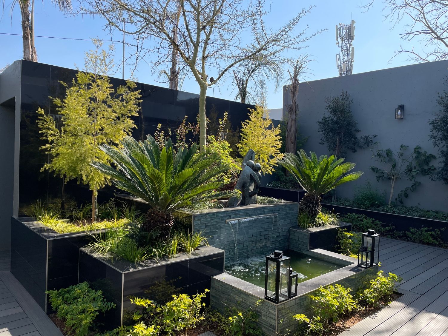 - Garden courtyard, complete with waterfalls and tropical trees.