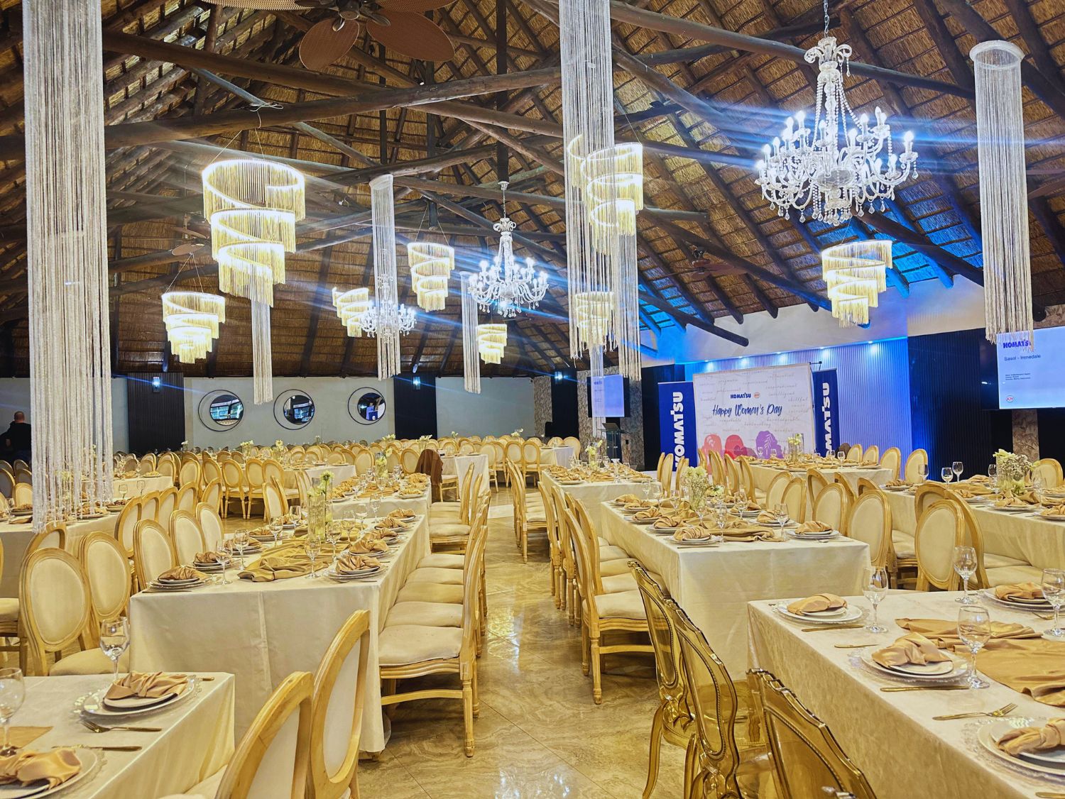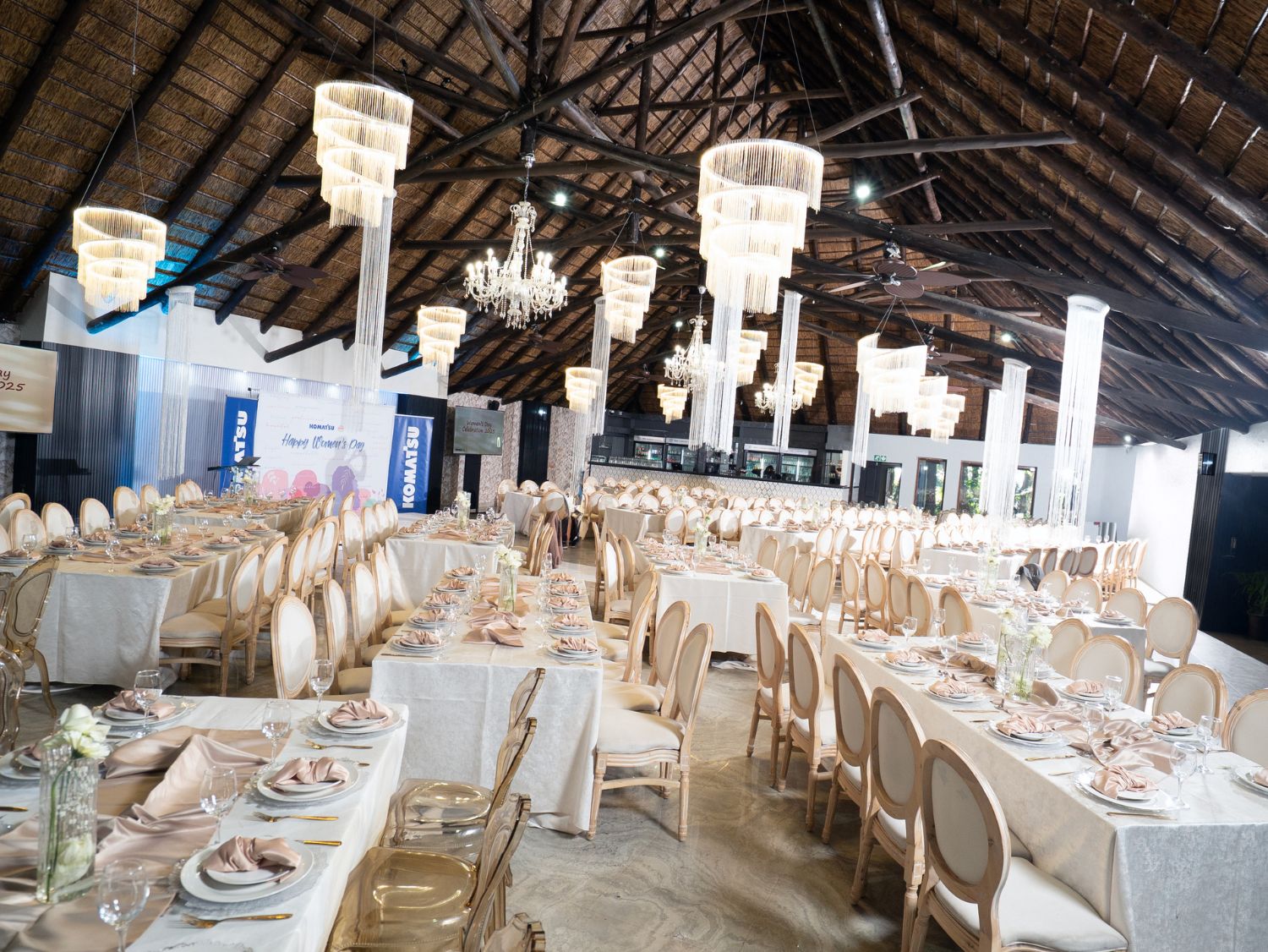 For a touch of Italian flavour, pre-drinks and canapés can be enjoyed by guests on The Piazza, and thereafter, delegates can feel free to meander to our seemingly floating Lily Pond Pavilion which cantilevers over the magnificent cascading Koi ponds. Finally, mouthwatering banquets can be served inside the welcoming Forest Banquet Hall with its noteworthy high thatch roof aesthetic.