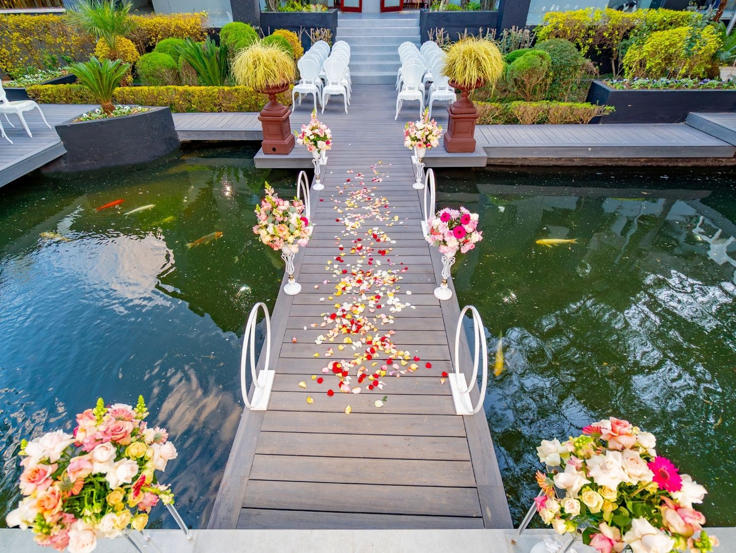During the ceremony, guests are seated on decks surrounding the Koi ponds, and all eyes are on the bride as she makes her way down the stairs and walks over the boardwalk to the ceremony space. A lush landscape with tropical palms and indigenous trees frames the Koi Pond Pavilion.