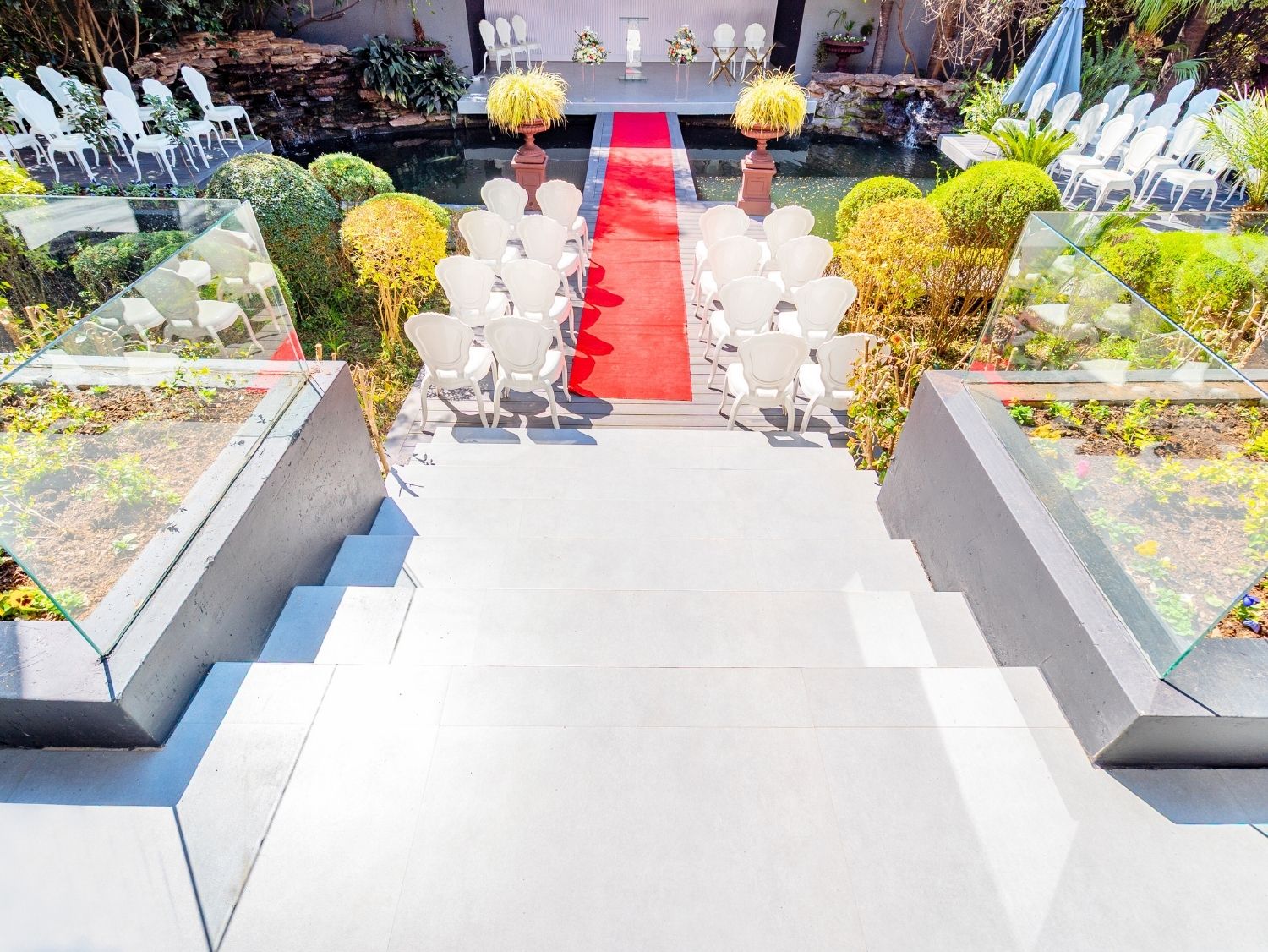 It can cater for up to 140 guests under roof banquet style. Guests who use the Elephant hall, will typically host their ceremony on the magnificent Koi Pond Pavilion, outside the Elephant Hall. The Koi Pond Pavilion is adjacent to the Elephant Hall and is an exquisite outdoor space with decking pavilions cantilevering over the Koi ponds. Schools of gold and orange Japanese Koi fish add an exotic touch to this already remarkable space and as such it is the ultimate venue for unforgettable wedding ceremonies.
