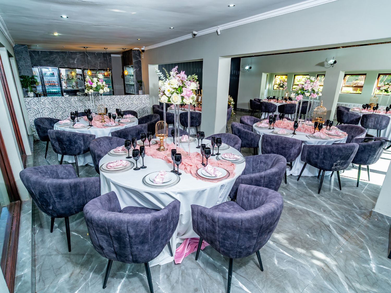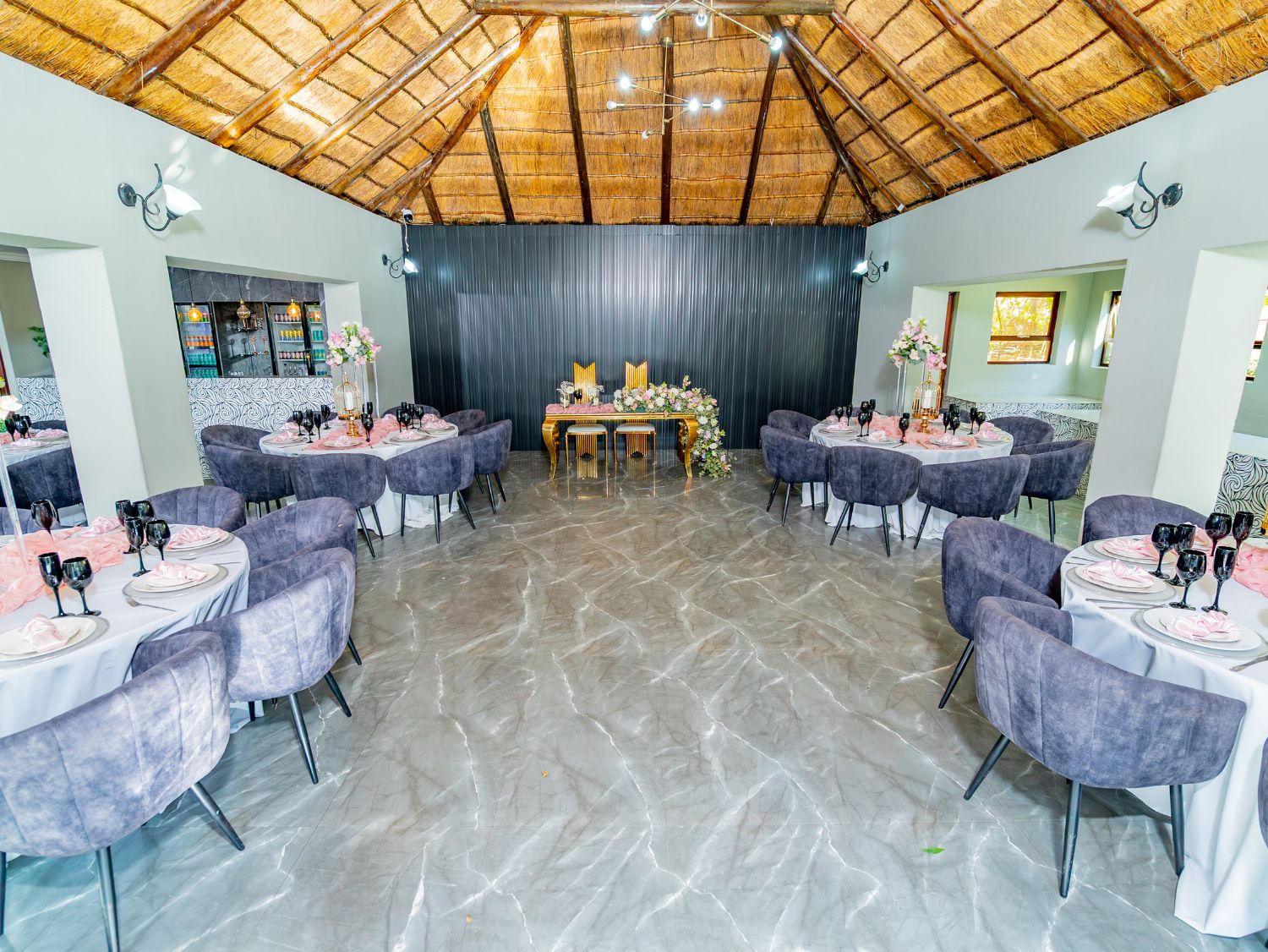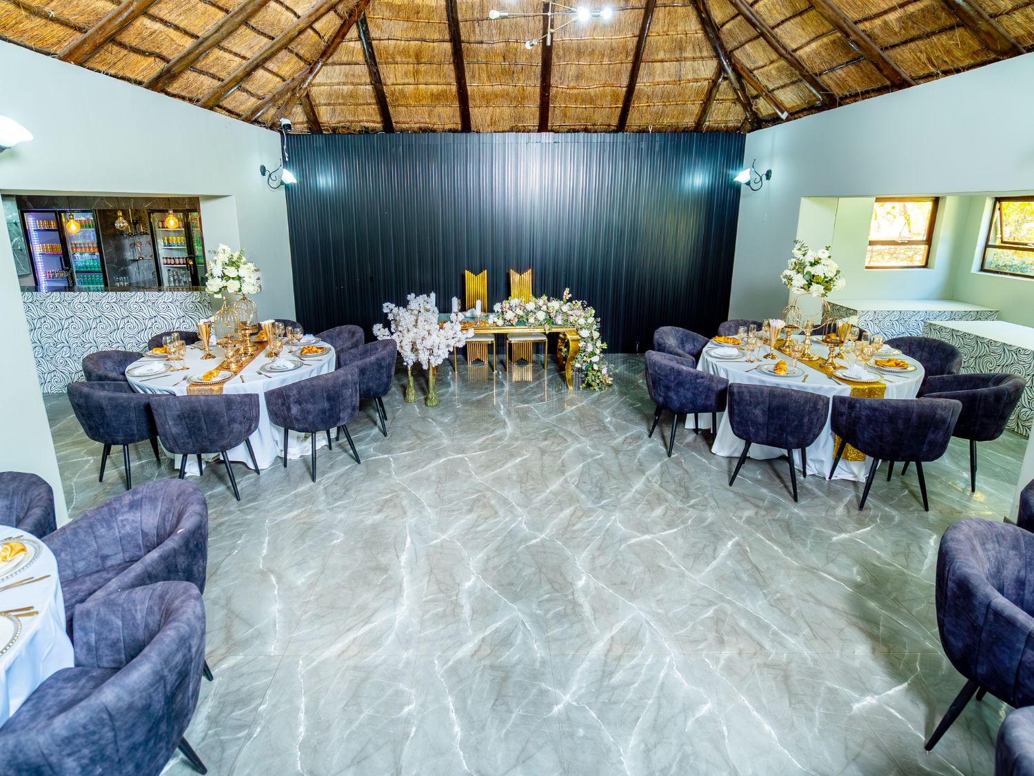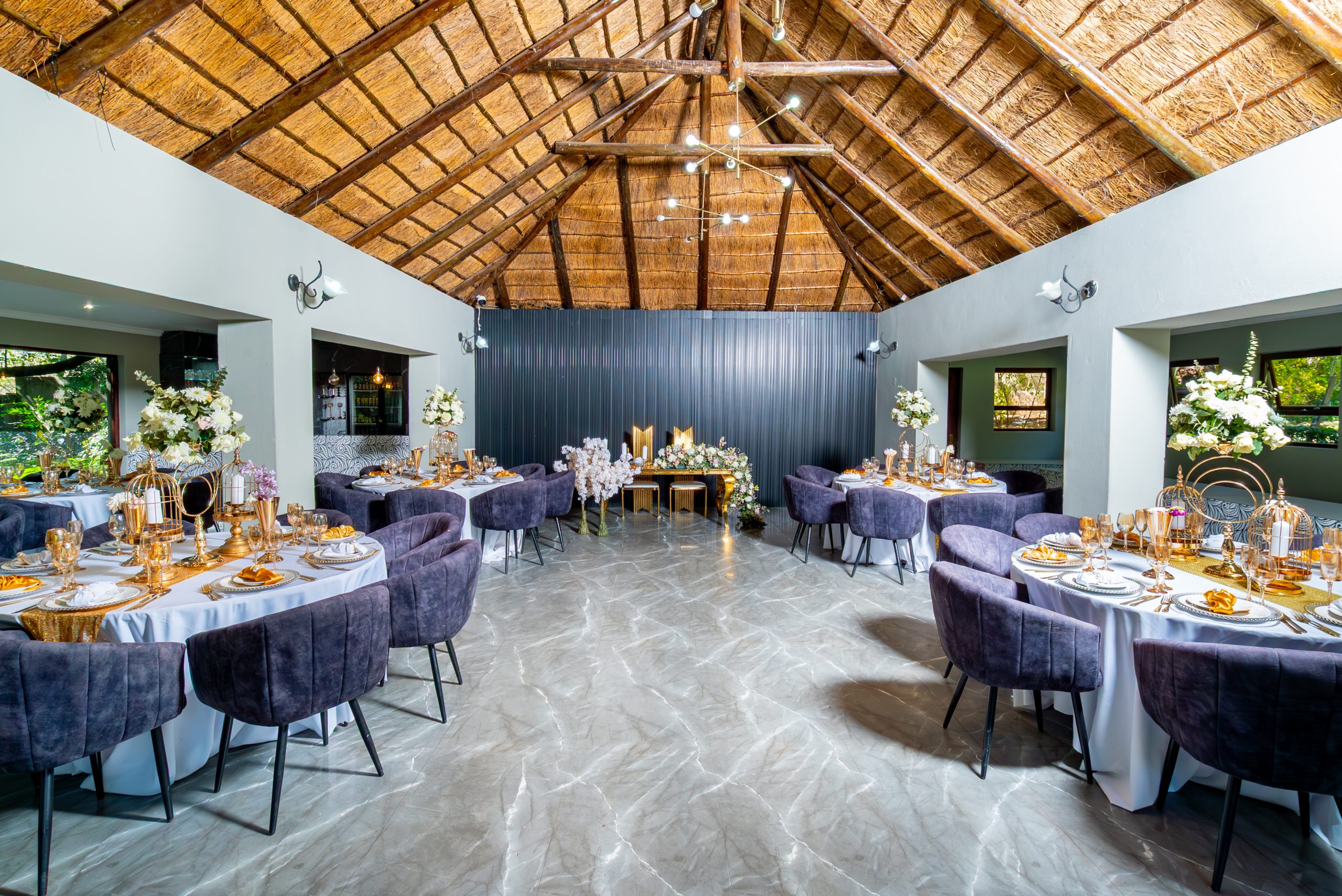 In 2020 our Olive Tree Hide was refurbished and enlarged to include a separate bar lounge area and impressive serving station to compliment this now glamorous, newly upgraded wedding venue. Marble flooring, a wooden deck, and modern finishes also add to its elegant design.