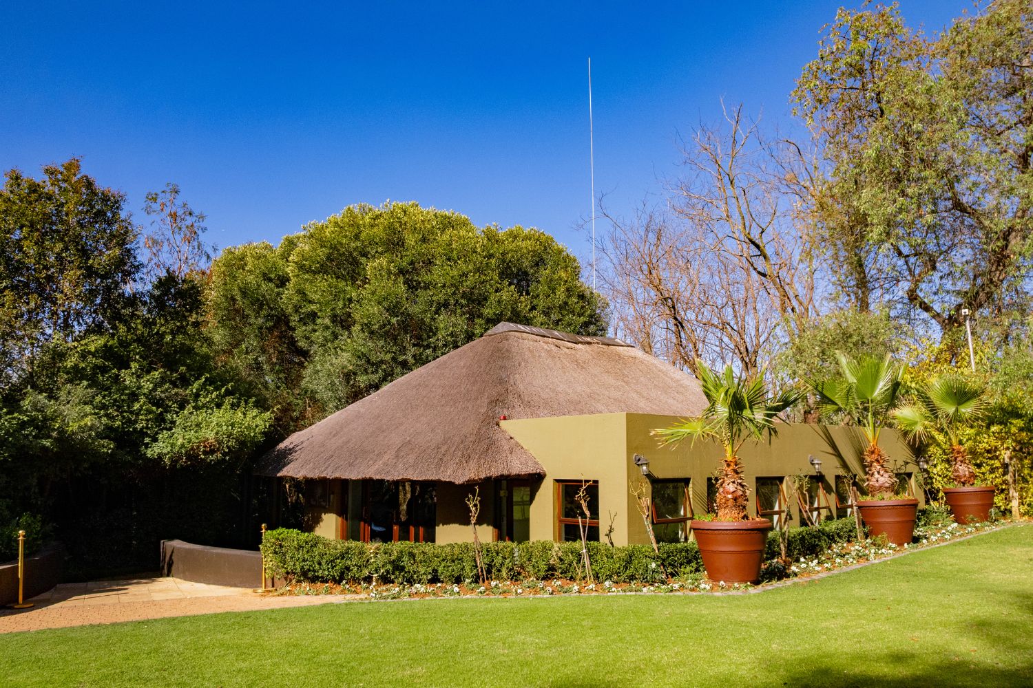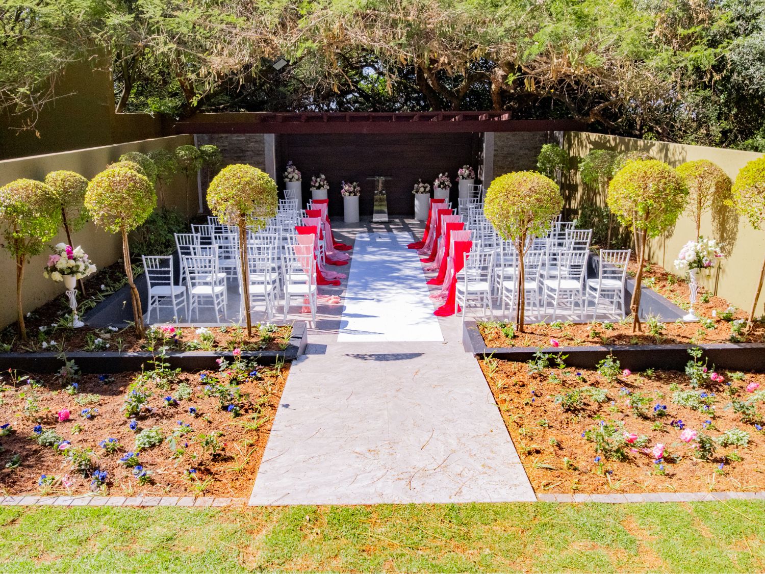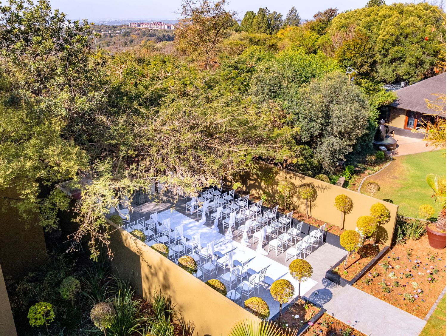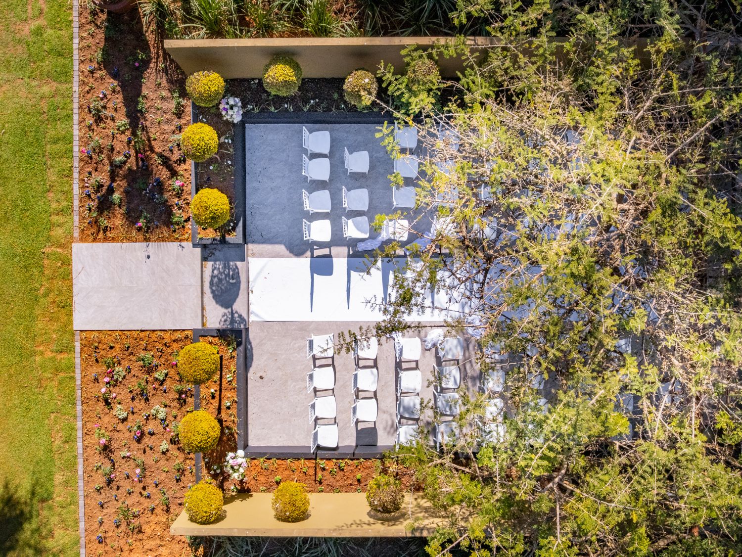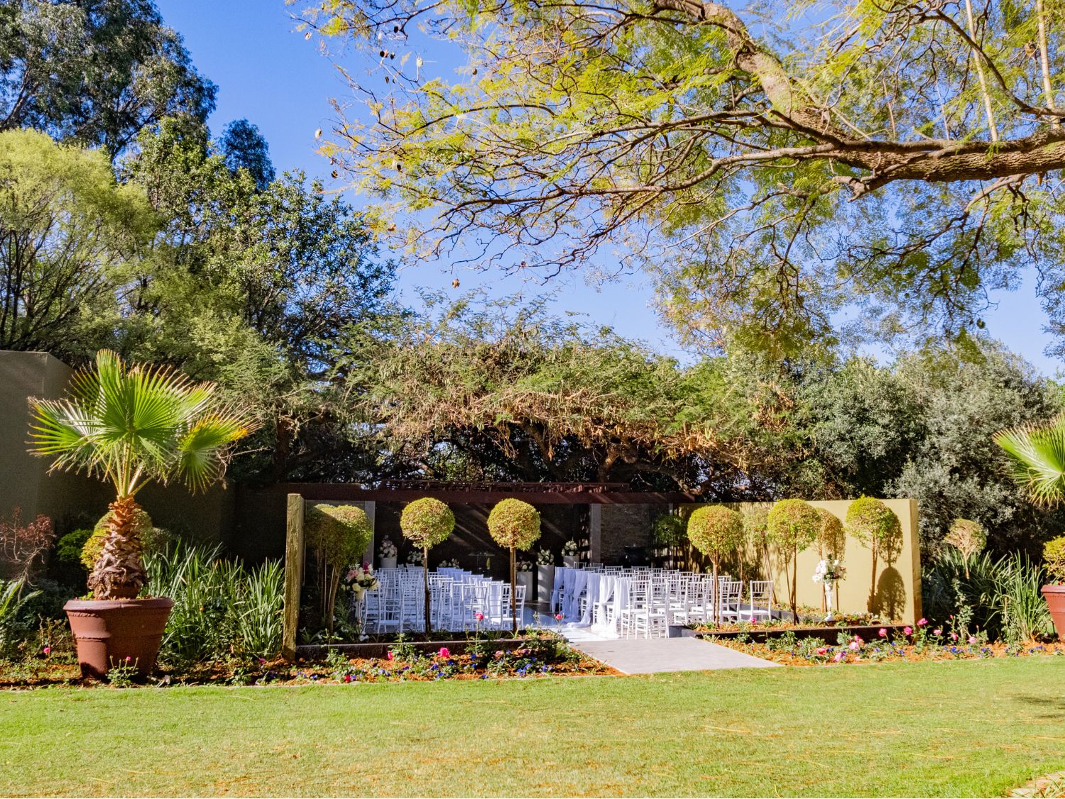 Although the Olive Tree Hide sits at the far end of The Lawn Terrace, along the way you will find a majestic Acacia Tree. It’s at this robust African tree that we have chosen to build our Lawn Terrace Chapel, shared with our Peacock Venue, both of which are ideal for intimate wedding ceremonies. It‘s an outdoor chapel with sandstone tiles underfoot and planter boxes filled with formal lollipops and iceberg roses – dramatic indeed! Pot cascades then frame the left and right of the stage and the branch canopy of the Acacia Tree forms the ceiling, making the experience truly one-of-a-kind. If you are looking for a garden wedding, then look no further!